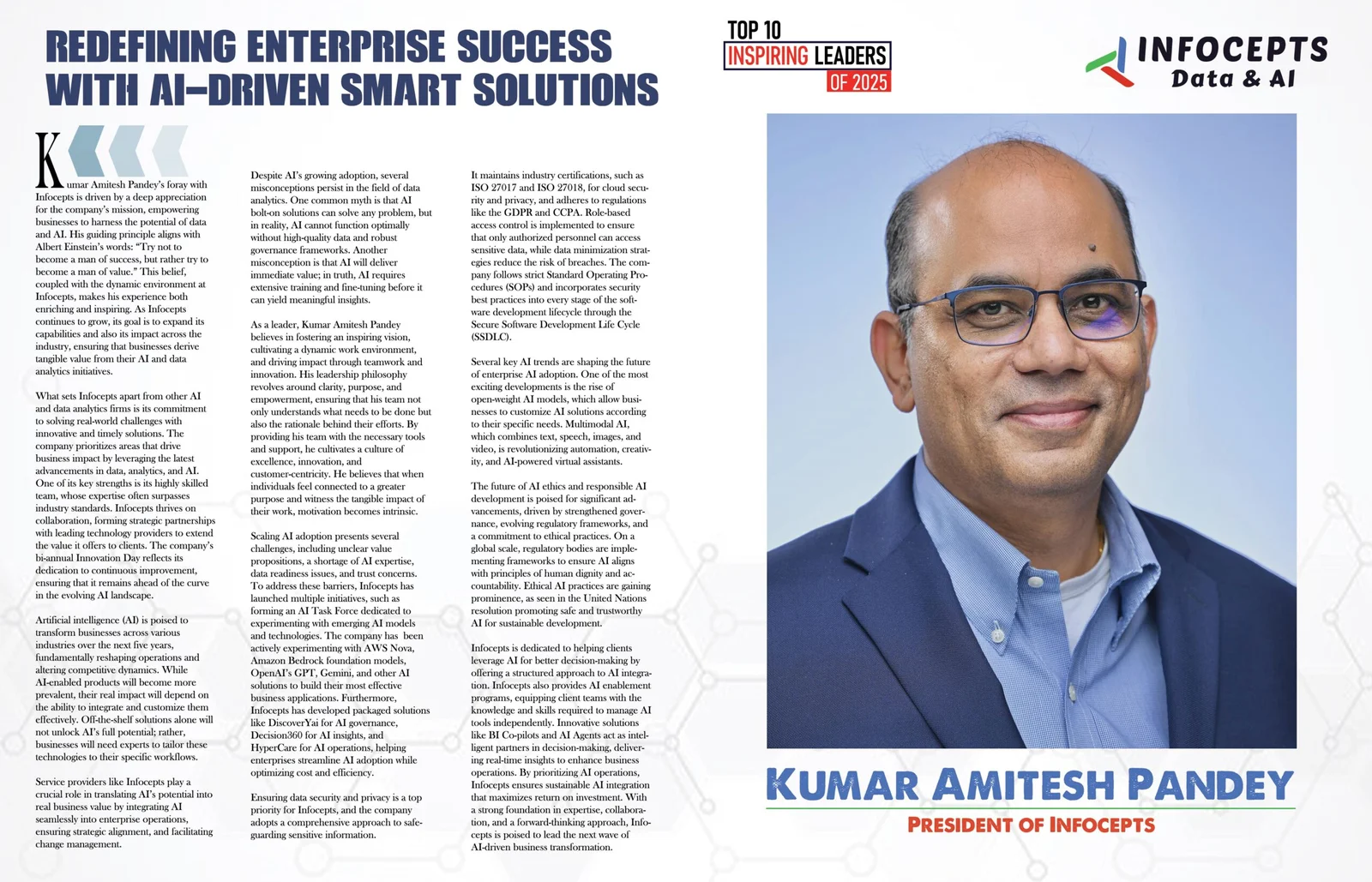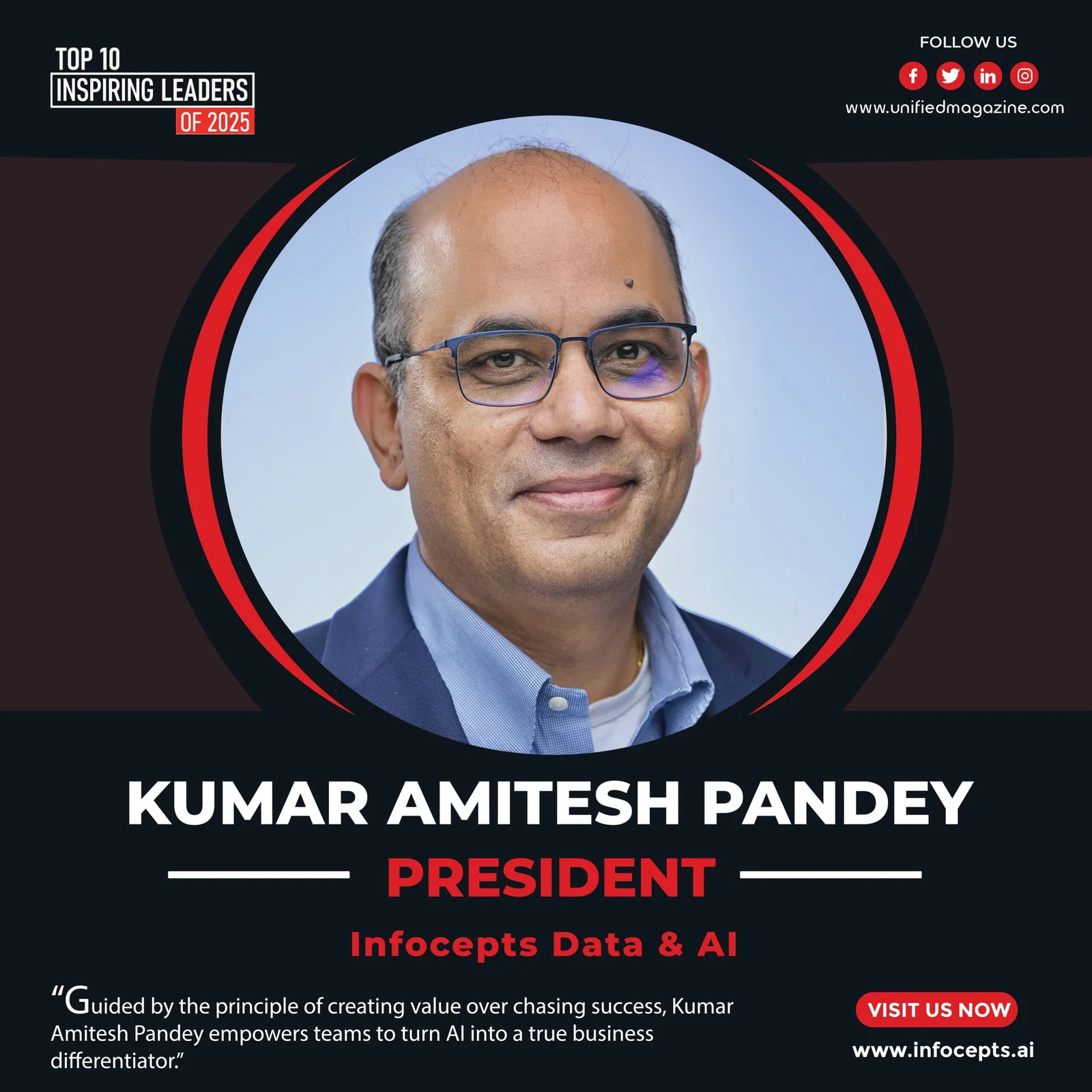 Washington, D.C. – June 26, 2025 — Infocepts is proud to announce that Kumar Amitesh Pandey, President of Infocepts, has been recognized by Unified Magazine as one of the Top 10 Inspiring Leaders of 2025. This prestigious honor celebrates visionary leaders who are driving meaningful change, empowering people, and shaping the future of their industries.